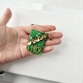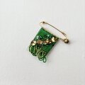 デザインには、中央に大きな丸いスパンコールを並べてありそのスパンコールを中心に刺繍糸の色に変化をだしています。アクセントに一つだけブロンズカラーのスパンコールにしています。周りにはいろいろな色味のグリーンのガラスビーズを散りばめ、全体の糸は、太さのある毛糸のようなふんわりとした糸になります。