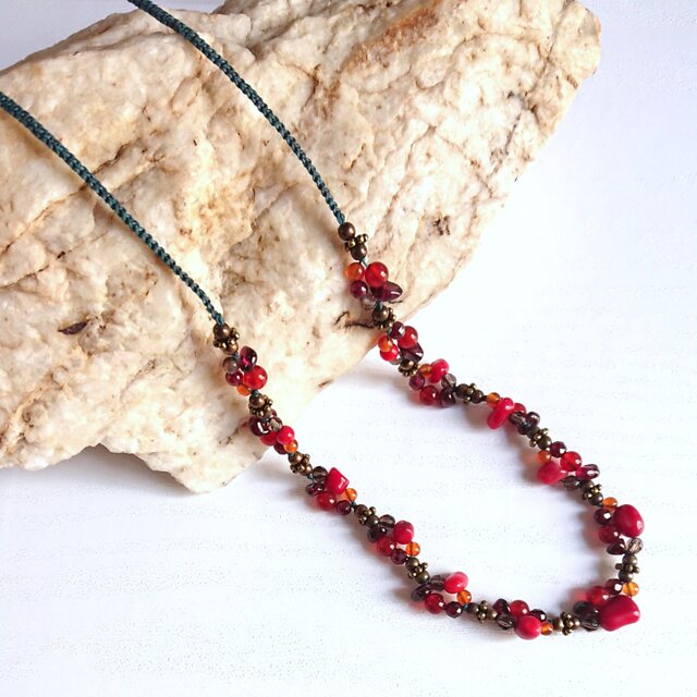 使用パーツ:サンゴ(染) ガーネット 赤メノウ(染) カーネリアン スモーキークォーツ メタルビーズ ワックスコード(ダークグリーン)