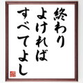 人生の結末の大切さを表現した前向きな名言「終わりよければすべてよし」の毛筆書道作品をお届けします。この言葉は途中でどんな困難や失敗があっても最後が良い結果になれば全て良い方向に向かうという意味で、シェイクスピアの戯曲のタイトルとしても知られている希望に満ちた格言です。現代においても多くの人に愛され続けている励ましのメッセージで、挫折や困難に直面した時でも最後まで諦めない気持ちを与えてくれる力強い言葉として親しまれています。熟練した書道家が一文字一文字丁寧に筆で書き上げたこの作品は、見る人に希望と粘り強さを与える美しい仕上がりになっています。黒い墨で力強く書かれた文字からは最後まで諦めない意志と前向きなエネルギーが感じられ、日々の生活に希望と勇気をもたらします。色紙に直筆で書かれた作品は額に入れてお届けするため、届いたその日からお部屋に飾ることができます。書斎やリビング、オフィスなど、どこに飾っても空間に希望と品格を与えてくれます。困難な状況を乗り越えようとしている方や最後まで頑張りたい方、人生を前向きに捉えたい方にとって、この書道作品は毎日の励みとなることでしょう。また、受験生への応援の贈り物や新しい挑戦を始める方への励ましの贈り物としても多くの方に選ばれています。この名言が持つ希望に満ちたメッセージは時代を超えて私たちに最後まで諦めないことの大切さを教えてくれ、見るたびに新たな希望と頑張る気持ちを与えてくれます。毛筆の美しい文字を通じて、結末の大切さと希望を持ち続けることの価値を感じる特別な時間をお楽しみください。