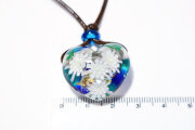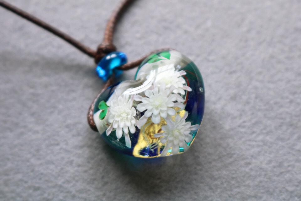 バーナーワークの技法で制作した、手作りのハート形のガラスのペンダントです。