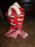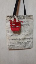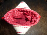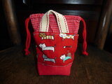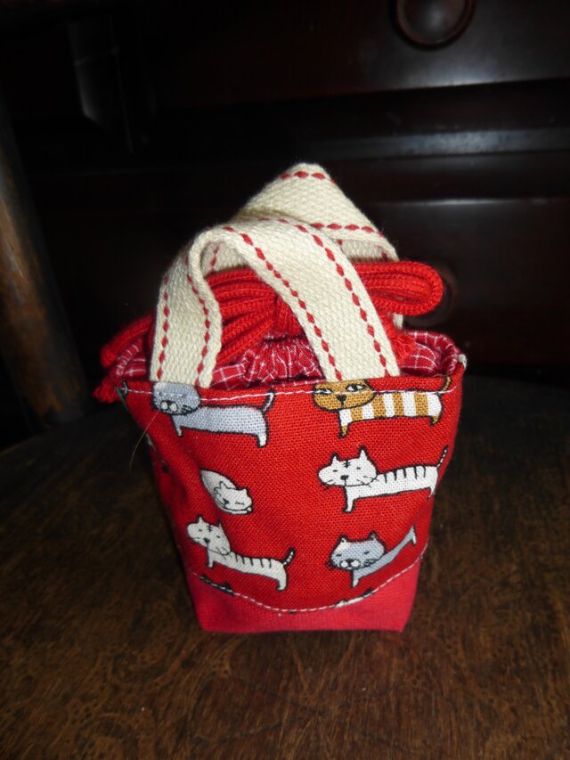 赤地に猫柄のオックス地の小さな小さなトートバッグです。底は赤の帆布です。入り口は赤のチェック地で巾着になっています。裏地も赤のチェック地を使用しています。