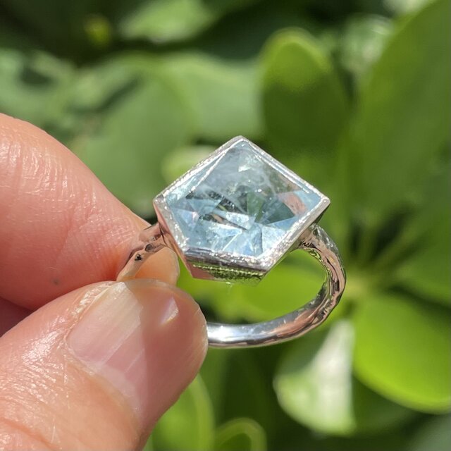 アクアマリン 5角形 立体チェックカット シルバーSV925リング