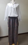 早速のご発送ありがとうございました。本日拝受し、手のかかった丁寧な縫製に見入っております。上品でモダンな色柄もデザインもとても素敵です。長く大事に着用させていただきます。共布のベルトはリボンタイやスカーフとして単品でも活用したいです。また機会がありましたらどうぞよろしくお願いいたします。