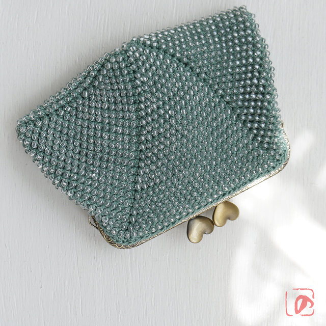ばあば作☆大きめ・総ガラスビーズのスクエアがま口(Eucalyptus・1753)
