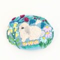 スモーキーブルーのリネン地にホーランドロップイヤーの子ウサギと小さな草花を彩りよく丁寧に刺繍しました。