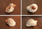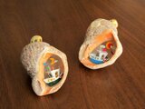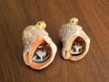 海辺で拾った貝がらの内側に船を浮かべてみました。学芸会のセットのようなイメージで…貝のてっぺんには小さいおうちが建っています。