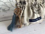 一点物 麻素材のアンティーク柄プリントとKeyモチーフのバネ口ポーチ