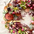 その上に、グリーンからブラウンに移り変わるユーカリ、赤く染まった木の実や葉、砕いた本物のシナモン、小枝などを載せていきました。