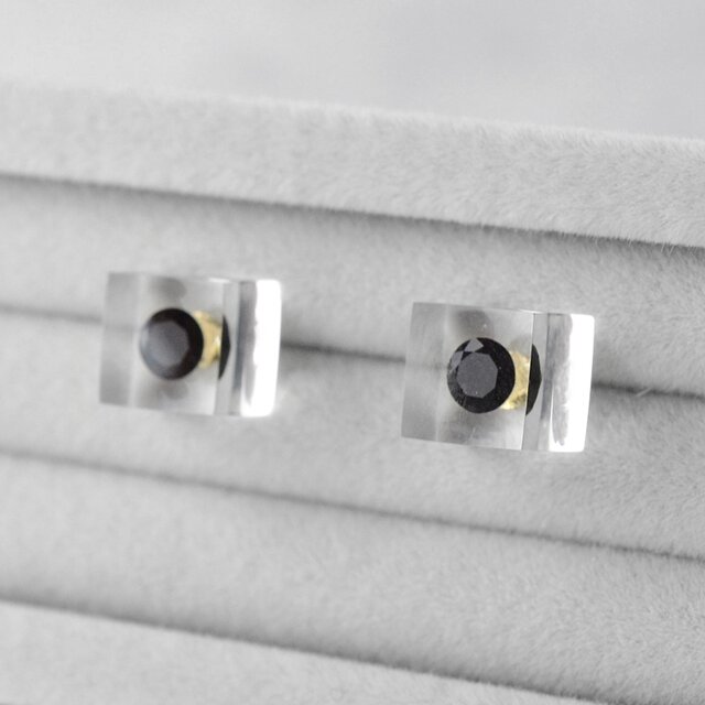 浮かぶブラックキュービックジルコニアのスタッドピアス ステンレス ゴールドカラー ギフト 誕生日プレゼント