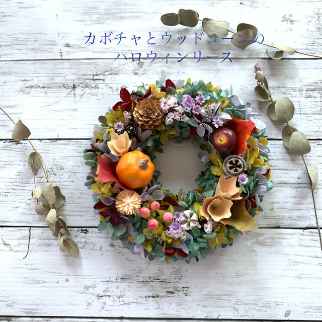 オレンジカボチャとウッドコーン・リンゴ・松ぼっくりなどをぎっしりと入れた可愛らしいハロウィンリースです。