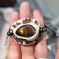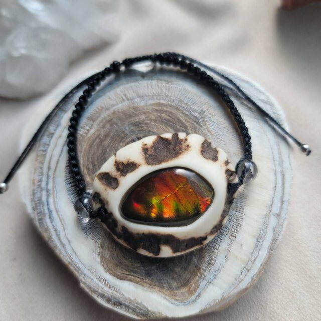 アンモライトは白亜紀(6500万年~1億3500万年前)の後期に生息していたアンモナイトが化石化する過程で、その殻表面のアラゴナイト(真珠層を構成する物質)が何千万年の間、地中内の鉱物、圧力により影響を受け、イリデッセンス効果を発する化石宝石です。