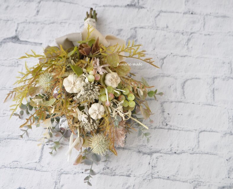 素材:アーティフィシャルフラワ-(造花):ユーカリ・ブラウングリーン色のグラス・アンバーバーム(トゲトゲの実)・淡い緑色の葡萄・ナッツ、など