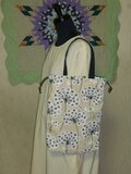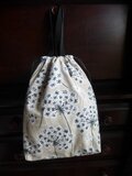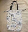 モノトーンのタンポポの綿毛柄の麻地の巾着にもなるトートバッグです。縦長でAサイズのノートや本が入ります。