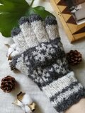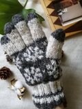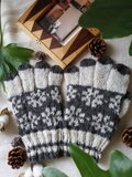 降りつもって少し経った雪のような白と落ち着いた濃い灰色で、花模様の5本指手袋を編みました。