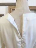 デザインは首元は開きすぎないタイプで、後ろが腰までひらくチャックで脱ぎ着しやすいです。袖は肩と袖口にギャザーが入っているパフスリーブの長袖、あまりボリュームでないタイプなのですっきりとしながらエレバンスな袖です。