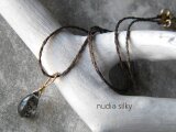 シルク100%の糸を、五倍子(ふし)の草木染でうっすら赤みがかった薄墨色に染め上げ、