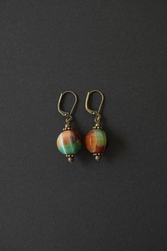 *大粒で贅沢な秋のピアスです。美しい縞模様の描かれたこの珍しい瑪瑙(メノウ)はベトナムより取り寄せております。深い赤と緑の孔雀瑪瑙、秋色の赤縞瑪瑙、それぞれ異なる模様に深みを感じることができます。瑪瑙(めのう)はカルセドニーの一種でアゲートとも呼ばれてます。美しい色と多彩な縞模様で古くから人々の信仰や護符となってきた瑪瑙は、集団の中での居場所を見つけられるよう融合と調和のエネルギーを与えてくれるといわれてます。孤独感を払拭し快活さを取り戻してくれるでしょう。