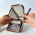 焦茶の牛革を背景に、優しい光沢のある糸で、