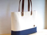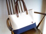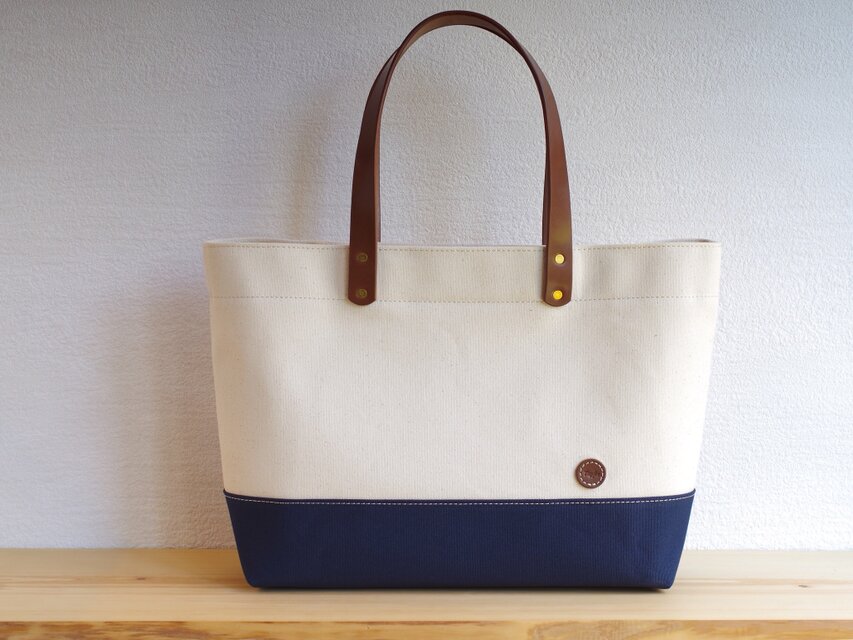 レザーハンドル帆布トートバッグ A4横長 生成り×ネイビー