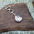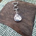 シルバー950製(キーリングを除く)ブルーアパタイトという天然石を使用したキーホルダーorチャームです。オーバーレイという透かし技法を用いハートを背負ったブチの猫をお供にしました。尚これは他でも販売していますので重ならないように購入前に必ず質問より在庫確認してください。