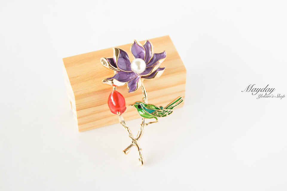 『夏の風物詩〜ハスの花と小鳥のブローチ』