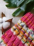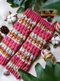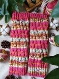 濃いストロベリーピンクにポツポツ入る白や緑や黄が可愛い、28cm長さのスパイラル編みレッグウォーマーです。