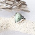 淡いグリーンと複雑な模様が美しい日高翡翠をシンプルなラインの個性的なリングに仕上げました。
