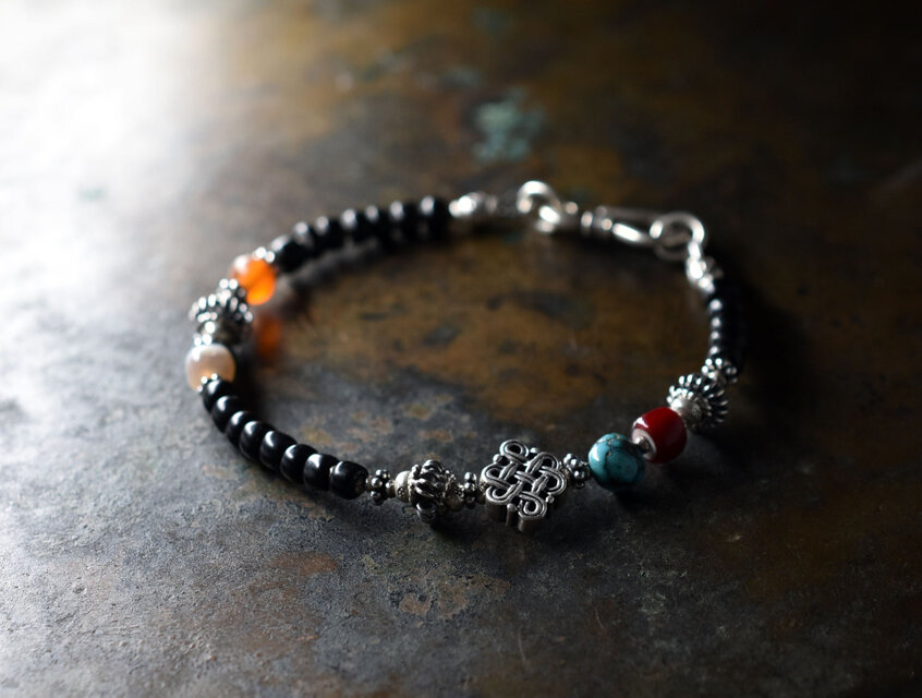 エンドレスノットとoldチベタンターコイズ、血赤ホワイトハーツ、古代瑪瑙、古代カーネリアン、漆黒ビーズを繋いだブレスです。