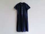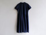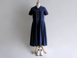 ボディラインをあまり拾わない、ゆったりとしたシルエットのシンプルなワンピースです。紺×青のギンガムチェック柄の落ち着いた雰囲気を活かして、フラットのへちまカラーと、控えめのパフスリーブ、スカート部分にはたっぷりとタックを取って、どことなくクラシックな感じのするワンピースに仕立ててみました。前たてに並んだ白い貝ボタンがアクセントです。