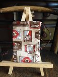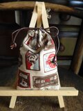 レトロな喫茶店の看板柄の木綿の小さな巾着袋です。裏地は茶色の大き目のチェック柄のコットンを使っています。。