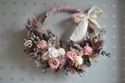 ヌードピンクな花色に合わせ落ち着いた雰囲気のリースブーケに