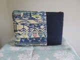 生地は型染が薄手の帯地、無地の部分は紺色の紬です。