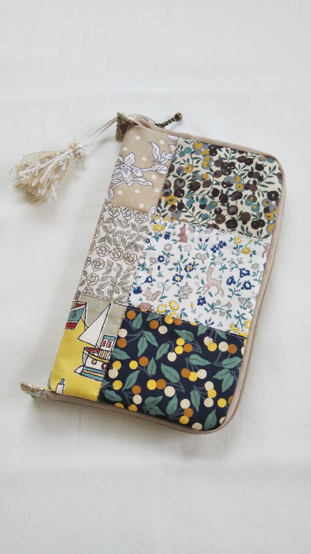 ファスナー(ベージュ)の上下はリバティでくるみ、アヴリルのかわいい糸でタッセルをつけ、ポイントになっています。