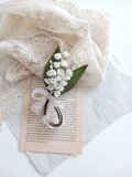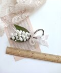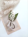 すずらんの花芯と蕾はパールペップで、トーションレースリボンを結び、お洒落なコサージュに仕上げました。