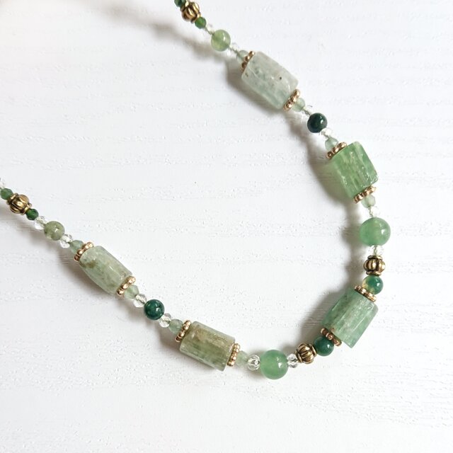 ひとつひとつ色味が異なるグリーンカイヤナイトを使ったネックレスです。
