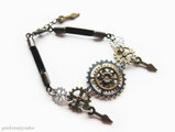 色違い形違いの歯車達と針モチーフがメインの革紐のブレスレットです。