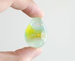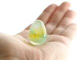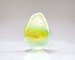 重ね合わせるガラスの色合いと重ね方を変えることで、水彩画のような色が混ざり合う様子を表現できることを知り、色とりどりのガラスを重ねて製作した小さなガラスの雫型オブジェです。