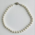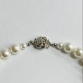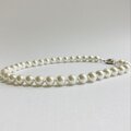 オールノットネックレスの特徴として、万が一、糸が切れた場合でも最小限で抑えられる点や、玉同士が密着していないので擦れあいにくく傷も付きにくい点、首回りにフィットしやすくなっている点等がございます。この仕様は特に海外で人気があり、比較的高品質アクセサリー類によくみられる仕様です。弊社の自社工場にて塗装したパールになります。品質の状態も維持されており、剥がれや大きな目立った傷などもございません。稀にピンホールや小さい凹み等が見られる場合がございますが、自社にて検品の上、品質に問題は無く許容範囲とさせて頂いております。