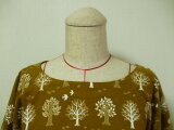 細コーデュロイ素材 からし色地×白木柄 ラウンドネックバルーン8分丈袖プルオーバー M~LLサイズ 綿100% 受注生産