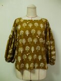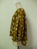 細コーデュロイ素材、からし色地×白木柄プリントのラウンドネックバルーン8分丈袖のプルオーバーです♪