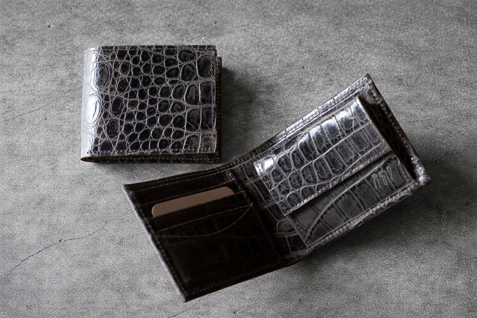 クロコ模様の型押しを施した後に、職人の手作業によって凹凸部分に加色することで、奥行きのある立体感を浮かび上がらせています。