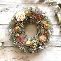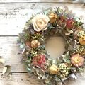 白のバラに淡いピンクの帝王貝細工、これにパープルカラーのアジサイを合わせたシックな秋色リースです。