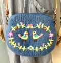 鳥とお花の羊毛刺繍ポシェット(ブルー×小鳥)
