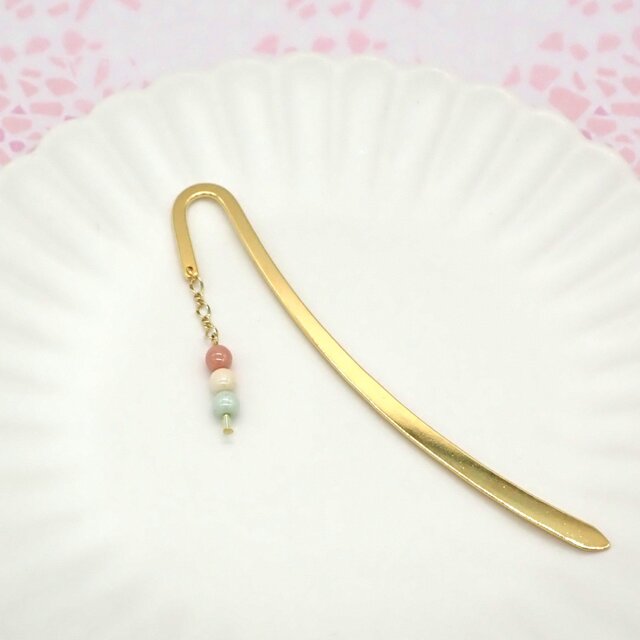 チェコビーズのお花見だんごがゆらゆら揺れる可愛いブックマーカーです。