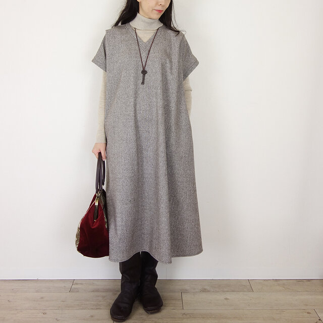[予約販売] ウールツイードブラウン襟Vワンピース