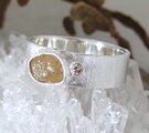 マスタードイエローのオータムカラー*ダイヤモンド原石に小さなシャンパンブラウンダイヤを添えたシルバーリング*実際は画像6枚目のような色合い、ゴツゴツでもさすがの煌めきを放つダイヤモンド原石をお楽しみ下さい*リングは重くなり過ぎない薄手の作りに古鉄錆のようなマット仕上げ、10~18号(推奨サイズ)の範囲を目安に調整可能、サイズ確定後にマットな覆輪で石留め致します*通常、黒化遅延処理を施しますが銀そのものの変化をお好みの場合は処理不要とお申し付けください*黒化防止ロジウムやK14・K18・K18ピンクゴールドコーティングご希望の場合は承ります(別途1000円)