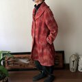 タック入りショールカラーと片袖ダブルベルトでカッコよく生地厚め手織り綿コート バックもティアード切り替えですっきり 赤絣