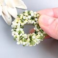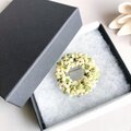 淡い黄色の淡水ケシ真珠と透明感のある黄緑のペリドットとの色合わせが素敵で、まるで宝石のリースのよう!コサージュの代わりに使える華やかでアートな趣のあるブローチです。