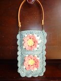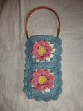 ピンクのお花のモチーフ編みを4枚(裏表)つなぎあわせたポーチです。周りはブルーグリーンの毛糸で縁編みをしています。裏地はついていません。