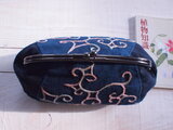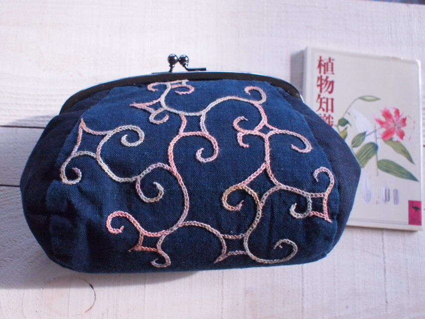 ポッコリ大きいがま口 古布の藍染にアイヌ刺繍 柿渋染めの糸で